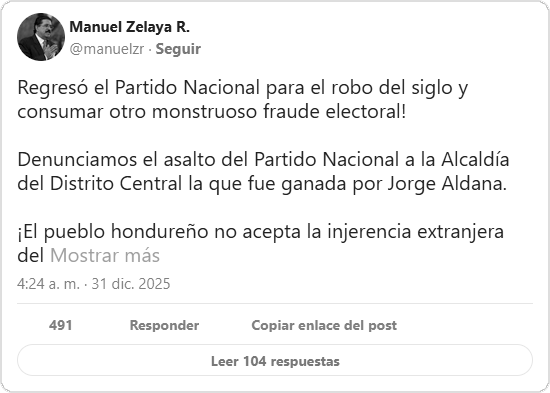 En su cuenta de la red social X, Zelaya afirmó que “regresó el Partido Nacional para el robo del siglo y consumar otro monstruoso fraude electoral”, y denunció específicamente el “asalto del Partido Nacional a la Alcaldía del Distrito Central”, cargo que, según aseguró, fue ganado por Jorge Aldana.