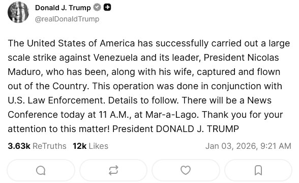 El presidente de EE.UU., Donald Trump, ofreció las primeras declaraciones, tras haber ordenado un ataque militar contra suelo venezolano, sustentado en una supuesta operación anticárteles que Caracas denunció insistentemente como una «agresión» para propiciar un «cambio de régimen», cuyo objetivo final es apoderarse de las vastas riquezas de la nación bolivariana, especialmente las petrolíferas y gasíferas.
