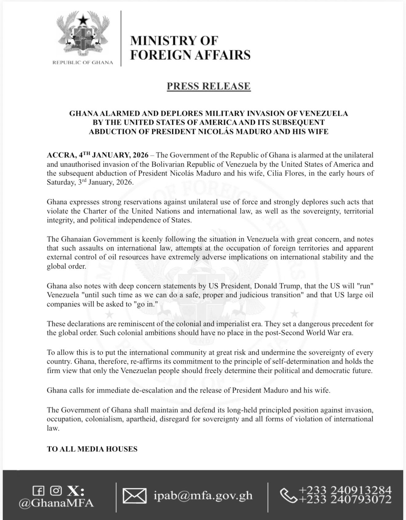 A través de un comunicado oficial, Accra expresó su rechazo categórico al uso unilateral de la fuerza y denunció una grave violación de la Carta de las Naciones Unidas, del derecho internacional y de los principios que resguardan la soberanía, la integridad territorial y la independencia política de los Estados.