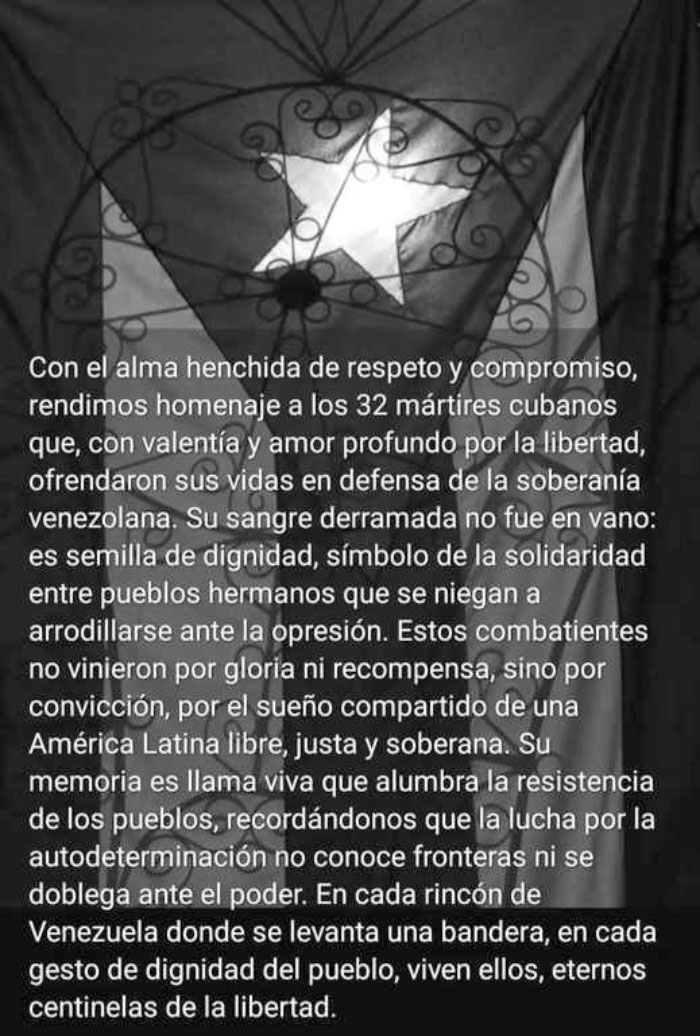 “Honor y gloria a los 32 héroes cubanos que perdieron sus vidas en defensa del pueblo venezolano ante el ataque de Estados Unidos contra ese hermano país”, añadió la Asociación Hermanos Saíz (AHS) desde su página en Facebook.