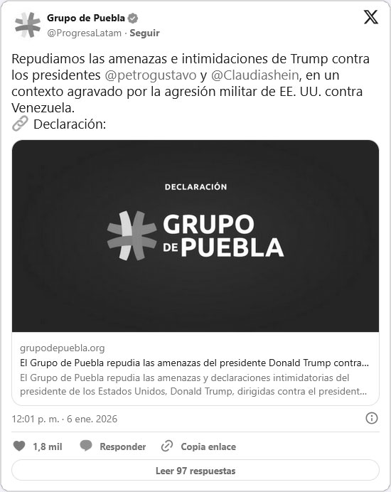 La amenaza lanzada por Donald Trump contra los presidentes Gustavo Petro y Claudia Sheinbaum provocó un rechazo inmediato en distintos sectores internacionales, con especial énfasis en el pronunciamiento del Grupo de Puebla.