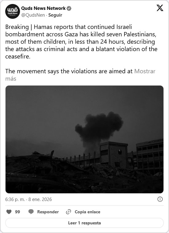 El Movimiento de Resistencia Islámica, Hamás condenó las constantes ofensivas israelíes contra la Franja de Gaza y alertó que constituyen una violación ostensible del acuerdo de alto al fuego en vigor y un agravamiento peligroso.