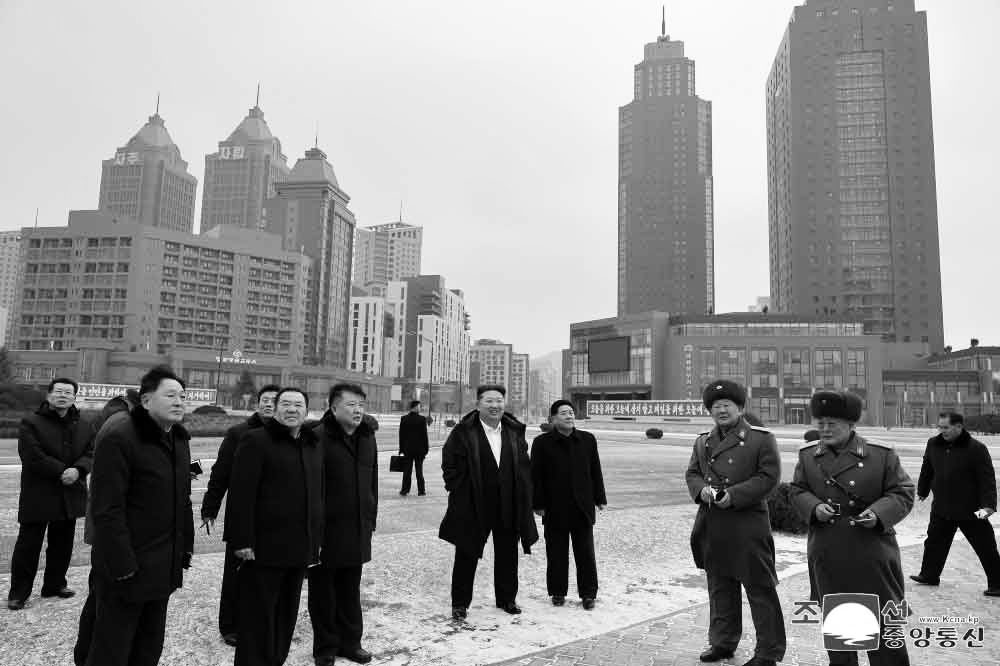 El mandatario fue acogido en el terreno por el vicepremier Kim Jong Gwan y los funcionarios del puesto de mando y del órgano de diseño para la construcción de viviendas para 50 mil núcleos familiares de la ciudad de Pyongyang.
