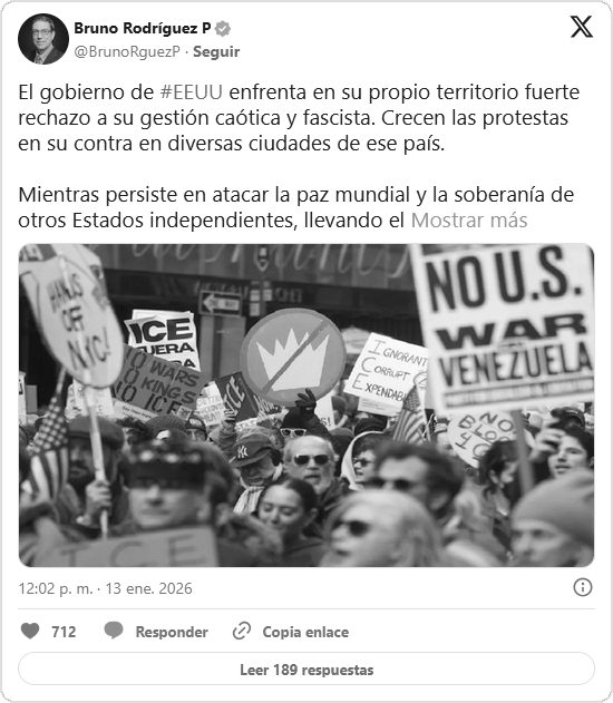 El ministro de Relaciones Exteriores de Cuba, Bruno Rodríguez, aseguró este martes que el Gobierno de Estados Unidos persiste en “atacar” la soberanía de otros Estados e impulsar un “caos belicista” que amenaza la paz mundial y la estabilidad internacional.
