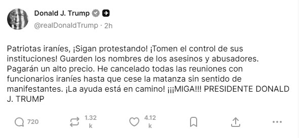 Y más recientemente, cuando se terminaba de redactar este artículo, el presidente estadounidense llamó a los «patriotas iraníes» a tomar «el control de sus instituciones». Anunció además que canceló las reuniones con todos los funcionarios iraníes y anunció: «¡La ayuda está en camino!»