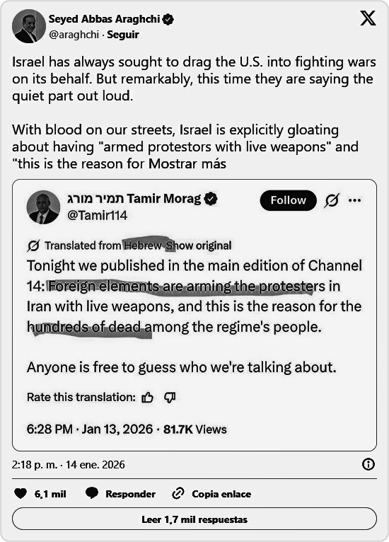El canciller iraní atribuyó los cientos de muertes ocurridas durante las protestas antigubernamentales que comenzaron a finales de diciembre al envío de armas por parte de Israel a los manifestantes. “Con sangre en nuestras calles, Israel se regodea explícitamente por haber ‘armado a los manifestantes con armas de fuego’”, denunció.