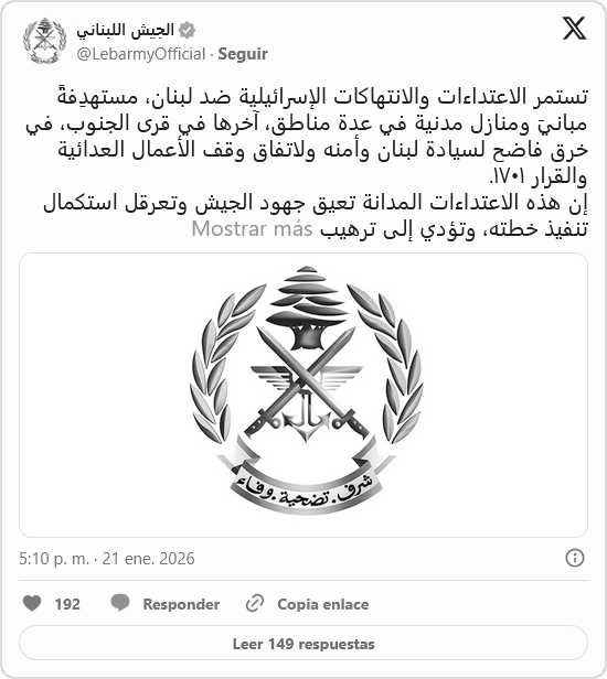 Beirut advirtió que estas acciones, lejos de ser incidentes aislados, forman parte de una escalada sistemática que busca socavar el acuerdo de cese de hostilidades y mantener bajo asedio permanente a las poblaciones del sur y el este del país. A pesar de que el acuerdo obliga a la retirada total de las fuerzas de ocupación, Israel mantiene tropas desplegadas ilegalmente en al menos cinco posiciones estratégicas, violando la Resolución 1701 del Consejo de Seguridad de la ONU.