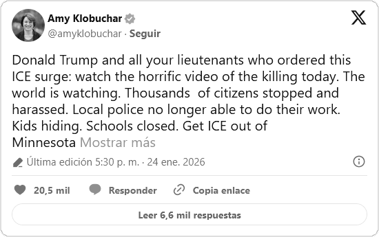 La senadora Amy Klobuchar dirigió un mensaje sin rodeos al presidente: «Donald Trump y todos tus tenientes que ordenaron este despliegue de ICE: miren el video horrible del asesinato de hoy. El mundo está mirando. Miles de ciudadanos detenidos y acosados. La policía local ya no puede hacer su trabajo. Niños escondiéndose. Escuelas cerradas. Saquen a ICE de Minnesota AHORA».