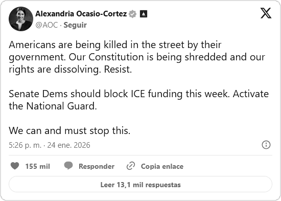 Desde Nueva York, la congresista Alexandria Ocasio-Cortez planteó el dilema en términos constitucionales: «Estadounidenses están siendo asesinados en la calle por su gobierno. Nuestra Constitución está siendo destruida y nuestros derechos se están disolviendo. Resistan. Los demócratas del Senado deberían bloquear la financiación de ICE esta semana. Activen la Guardia Nacional. Podemos y debemos detener esto».