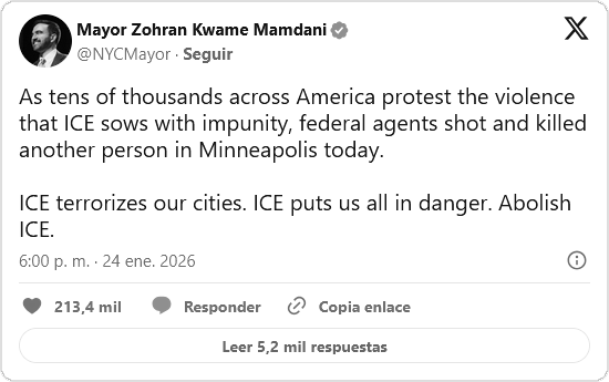 El recién electo alcalde de Nueva York, Zohran Kwame Mamdani, conectó el tiroteo con las decenas de miles que protestan en todo el país: «Mientras Estados Unidos se levanta contra la violencia que ICE siembra con impunidad, agentes federales dispararon y mataron a otra persona en Minneapolis hoy. ICE aterroriza nuestras ciudades. ICE nos pone a todos en peligro. Abolir ICE».