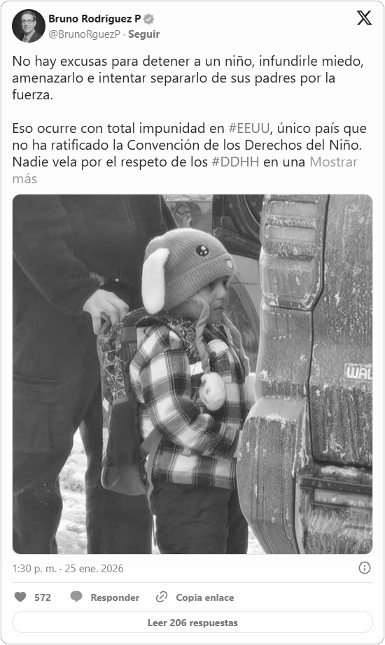El ministro de Relaciones Exteriores de Cuba, Bruno Rodríguez, repudió este domingo la detención del niño Liam Conejo Ramos, de cinco años, por parte del Servicio de Inmigración y Control de Aduanas de Estados Unidos (ICE), calificando el hecho como un acto inadmisible que refleja la impunidad con la que se violan los derechos humanos en ese país.