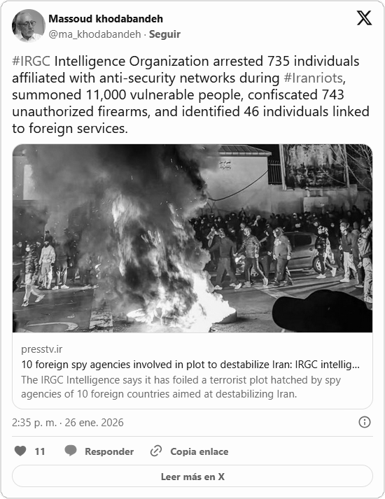 El Gobierno iraní considera que este complot y los disturbios son parte de una campaña para perturbar la soberanía iraní por parte de Estados Unidos e Israel tras el fracaso de la guerra de 12 días llevada a cabo en junio.