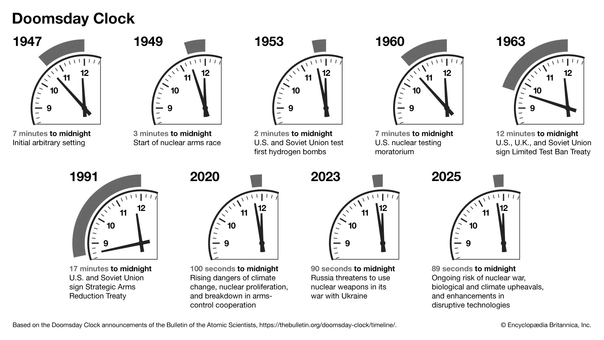 Ya en 1953, después de que EE.UU. y la URSS probaran sus artefactos termonucleares, el Reloj del Juicio Final marcó las 23:58, hora a la que volvió en 2018 y 2019. El año más tranquilo fue 1991, cuando las manecillas marcaron 17 minutos hasta el momento de un posible cataclismo nuclear.
