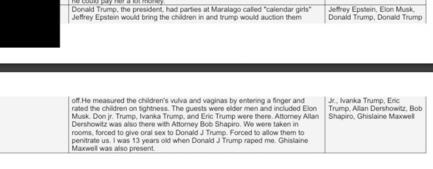 «Nos llevaron a unas habitaciones y nos obligaron a practicar sexo oral a Donald J. Trump. Nos obligaron a permitir que nos penetraran. Tenía 13 años cuando Donald J. Trump me violó«, se lee también en el escrito.