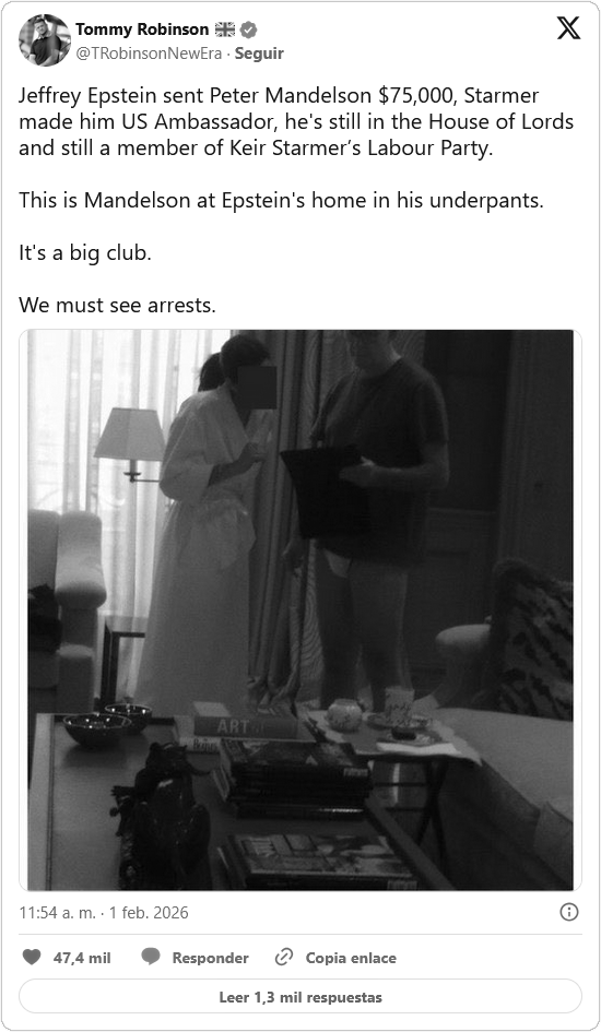 Anteriormente, Peter Mandelson admitió detalles «muy vergonzosos» de su relación con el financiero. Así lo dijo después de la publicación por un comité del Congreso estadounidense de un libro de 238 páginas que había sido entregado a Jeffrey Epstein por sus principales amigos con motivo de la celebración de sus 50 años. Los documentos mostraron que el ahora exembajador británico en EE.UU. definió al delincuente como su «mejor amigo».