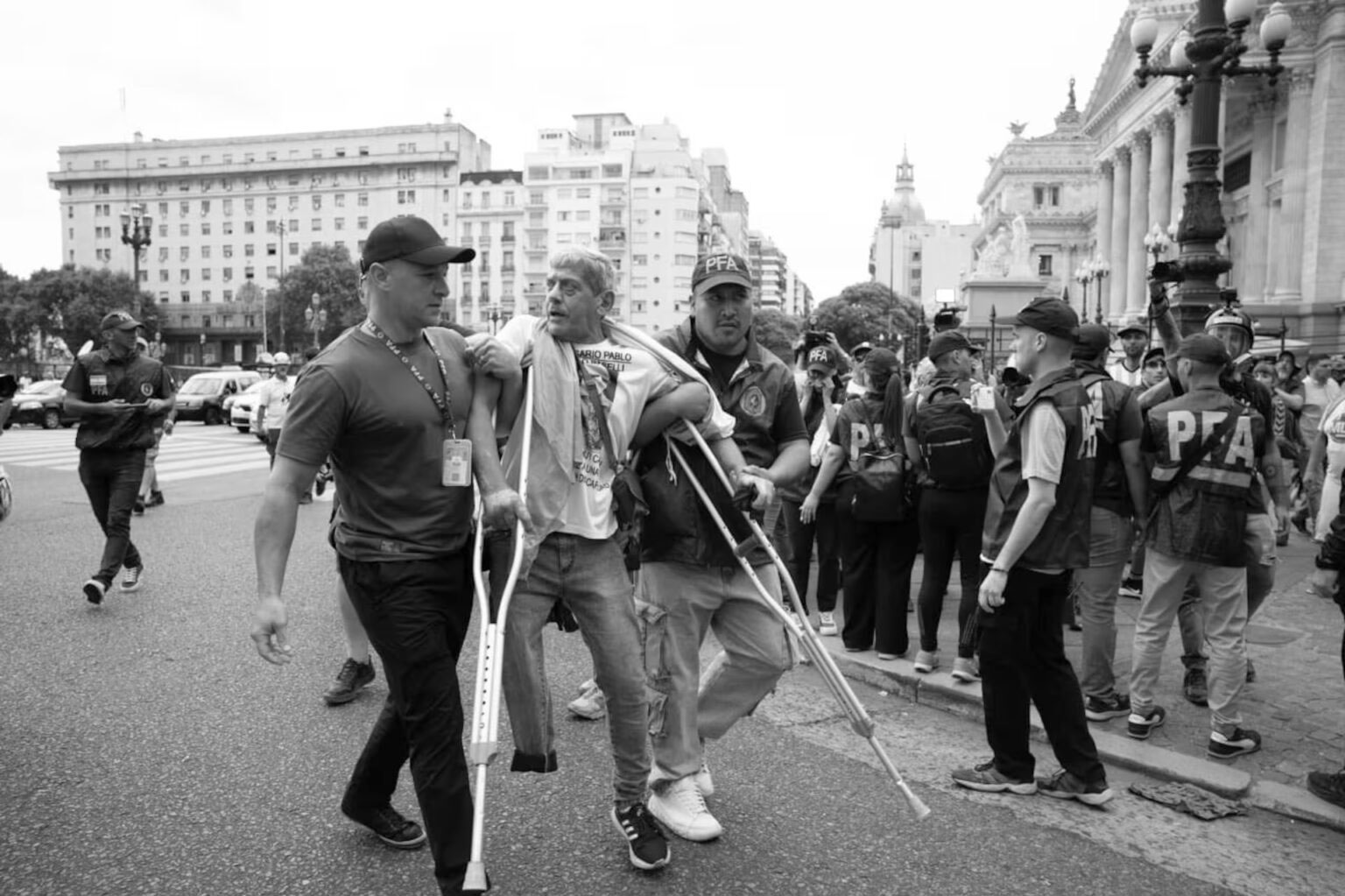 En las inmediaciones del Congreso en el centro de la ciudad de Buenos Aires, los movilizados fueron reprimidos por la Policía Federal, entre ellos el padre Paco (un militante y cura argentino), que acompañaba como es habitual a los jubilados y las jubiladas en la marcha, que piden una jubilación digna.