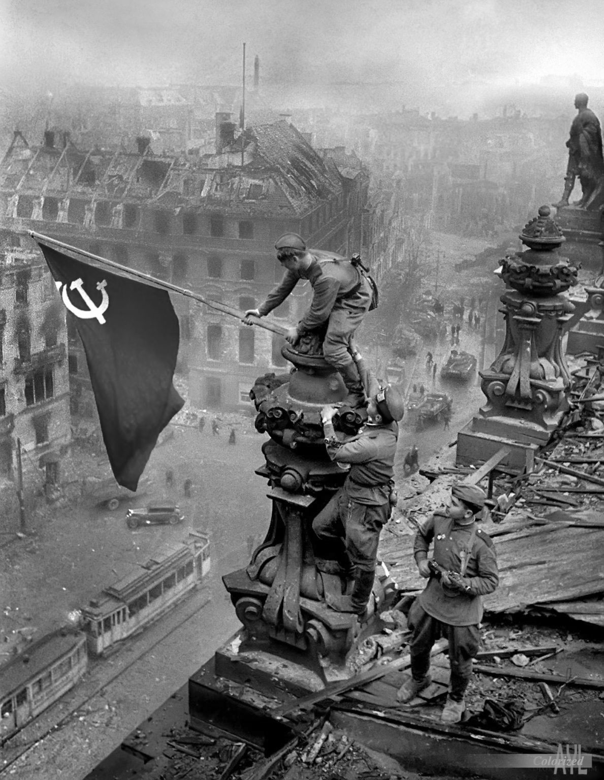 Primero que fue la URSS quien realmente venció a Alemania y quien llevo el mayor peso de la guerra, sufriendo además el mayor castigo y pagando un precio brutal e cuanto a perdidas de vidas humanas y destrucción.