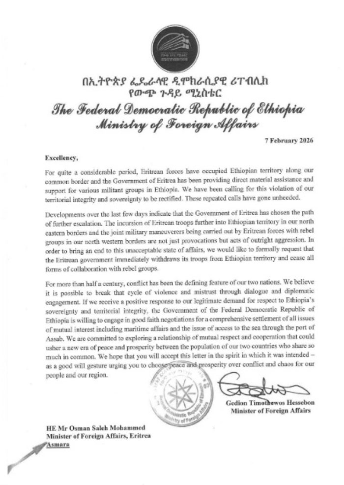 Una carta enviada por el ministro de Asuntos Exteriores, Gedion Timothewos, a su homólogo eritreo, Osman Saleh Mohammed, fechada la víspera denunció que durante un período considerable las fuerzas de Asmara ocuparon suelo etíope a lo largo de la frontera común.