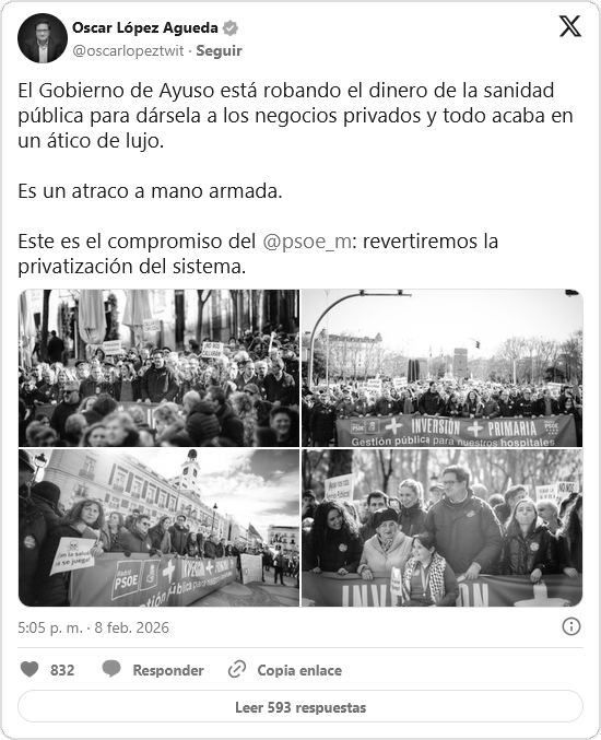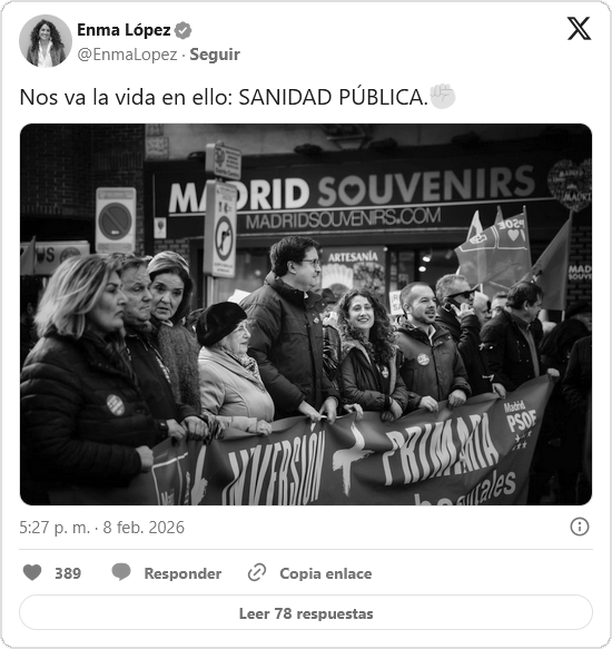 En el plano político, figuras de la izquierda se sumaron a la caminata para denunciar que la salud pública está bajo «el asedio de los buitres» financieros. Los líderes señalaron que la administración de Ayuso está transformando un derecho universal en un negocio rentable para grandes empresas y aseguradoras privadas. Criticaron que las élites económicas estén capturando los recursos del Estado, debilitando la estructura social y el carácter solidario de la sanidad pública.