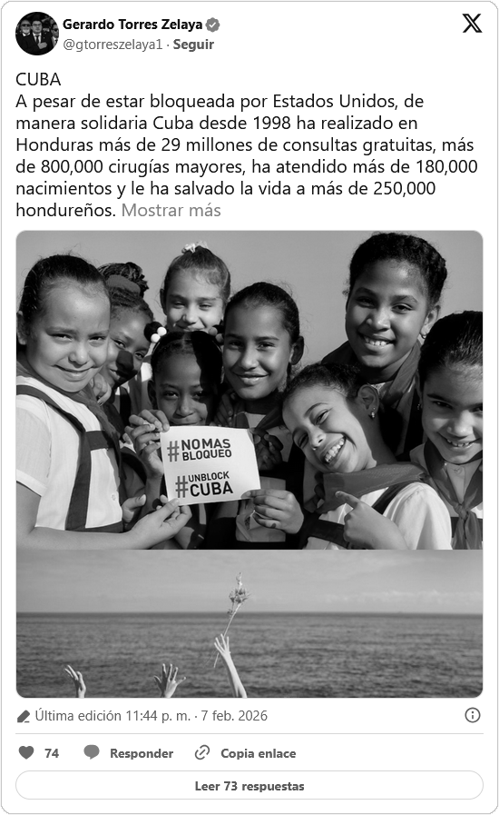 Pese a estar bloqueada por Washington, “de manera solidaria Cuba ha realizado en Honduras más de 29 millones de consultas gratuitas, más de 800 mil cirugías mayores, ha atendido más de 180 mil nacimientos y le ha salvado la vida a más de 250 mil hondureños”, subrayó Torres en su cuenta de X.