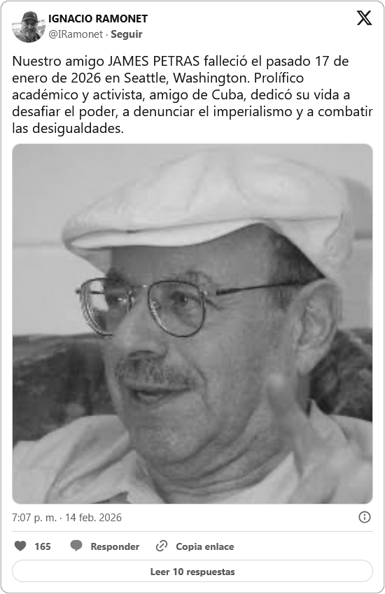 «James Petras falleció pacíficamente el 17 de enero de 2026 en Seattle, Washington, rodeado de su familia. Prolífico académico y activista, dedicó su vida a desafiar el poder, el imperialismo y la desigualdad», dieron a conocer en un obituario compartido en el sitio web del intelectual.