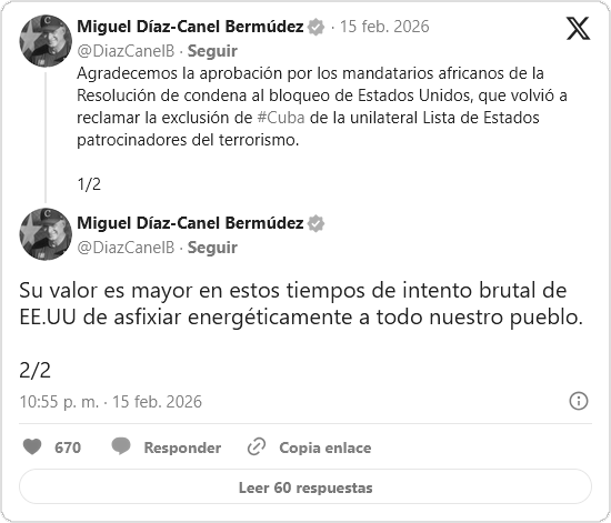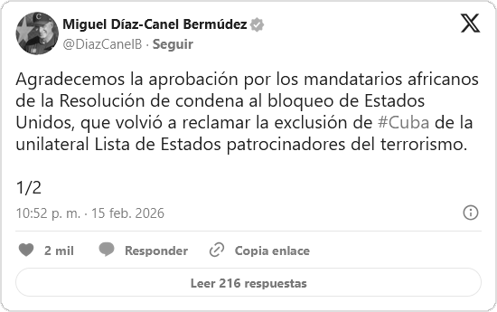El mandatario cubano, Miguel Díaz-Canel, calificó de “intento brutal“ las acciones de la Administración de Donald Trump para “asfixiar energéticamente“ la isla. En este contexto, el presidente expresó su gratitud hacia los líderes africanos, quienes, a través de la Asamblea de la Unión Africana, aprobaron por decimoséptima vez consecutiva una resolución que condena el bloqueo económico, comercial y financiero impuesto por Estados Unidos contra Cuba.
