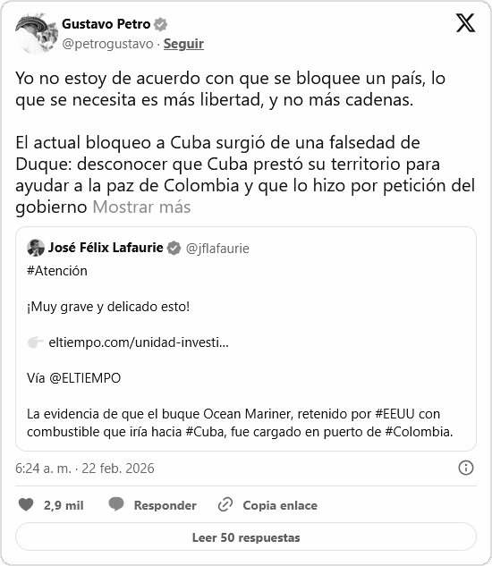 El presidente de Colombia, Gustavo Petro, pidió al Gobierno de Estados Unidos (EE.UU.), presidido por Donald Trump, “cambiar su política” hacia Cuba, ante el recrudecimiento del bloqueo económico y petrolero impuesto por Washington a la isla.