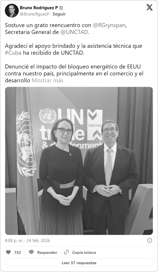 Por otra parte, el jefe de la diplomacia cubana se reunió con Tatiana Valovaya, Directora General de la Oficina de la ONU en Ginebra, e intercambio con Rebeca Grynspan, Secretaria General de la Conferencia de las Naciones Unidas sobre Comercio y Desarrollo (UNCTAD). En ese último espacio, Rodríguez agradeció la asistencia técnica recibida por dicho organismo.