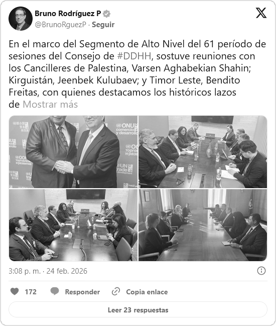 En el marco del Segmento de Alto Nivel del 61° período de sesiones del Consejo de Derechos Humanos de la Organización de las Naciones Unidas (ONU), el ministro de Relaciones Exteriores de Cuba, Bruno Rodríguez, desarrolló una agenda diplomática orientada a consolidar vínculos históricos y denunciar las agresiones económicas de Estados Unidos contra la isla caribeña.