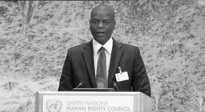 Durante su intervención en el Consejo de Derechos Humanos en Ginebra, el diplomático surafricano subrayó la necesidad urgente de poner fin a la ocupación ilegal israelí y denunció las acciones genocidas destinadas al desplazamiento permanente del pueblo palestino en la Franja de Gaza y Cisjordania. Foto: Captura de pantalla @RonaldLamola.