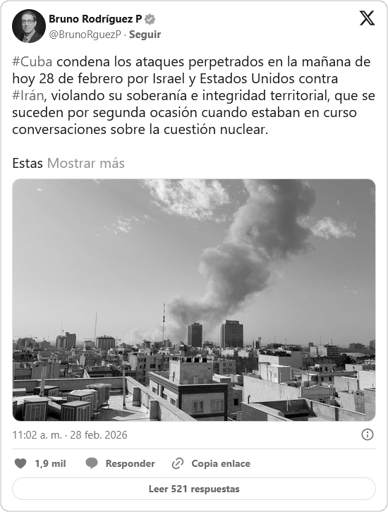 El Ministro de Relaciones Exteriores de Cuba, Bruno Rodríguez Parrilla, subrayó que «Cuba condena los ataques perpetrados en la mañana de hoy 28 de febrero por «Israel» y Estados Unidos contra Irán, violando su soberanía e integridad territorial, que se suceden por segunda ocasión cuando estaban en curso conversaciones sobre la cuestión nuclear».