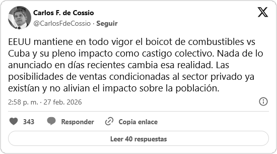 Actualmente, de acuerdo con el viceministro de Relaciones Exteriores de Cuba, Carlos Fernández de Cossío, “Estados Unidos mantiene en todo vigor el boicot de combustibles vs Cuba y su pleno impacto como castigo colectivo“.