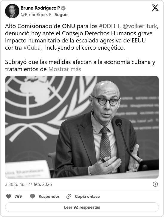 El Alto Comisionado de las Naciones Unidas para los Derechos Humanos, Volker Türk, denunció este viernes 27 de febrero ante el Consejo de Derechos Humanos el impacto humanitario de las políticas de Estados Unidos contra de Cuba. “Nada puede justificar la asfixia de una población“, enfatizó Türk.