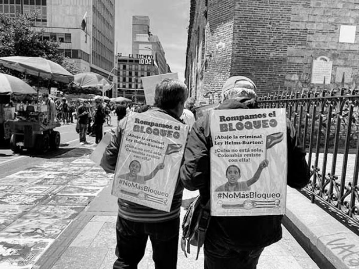 Los manifestantes caminaron por la céntrica carrera séptima de esta capital, repartieron volantes a los transeúntes y también aprovecharon para denunciar el recrudecimiento del cerco, al que calificaron de genocida, y que de manera unilateral aplica el gobierno de Washington.
