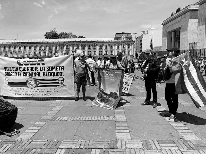 Con pancartas, consignas y canciones revolucionarias, así como con banderas cubanas y colombianas, los activistas arribaron a la Plaza de Bolívar donde realizaron un mitin para refrendar su apoyo al gobierno y el pueblo cubanos.
