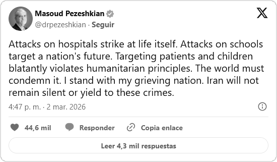 El presidente de Irán, Masoud Pezeshkian, condenó este lunes los ataques perpetrados por Estados Unidos e Israel contra escuelas y hospitales, haciendo un llamado al mundo a condenar tales acciones y resaltando que son una flagrante violación de «los principios humanitarios».