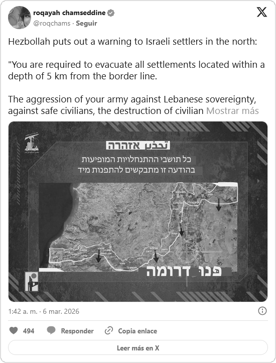 “Se les exige evacuar todos los asentamientos ubicados a 5 kilómetros de la línea fronteriza”. La declaración de Hezbolá enfatizó que los continuos ataques de las fuerzas israelíes contra el Líbano no quedarán sin respuesta.