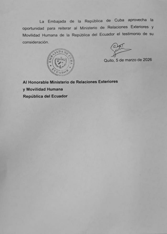 Esta decisión fue trasladada oficialmente, el 5 de marzo de 2026, por la Embajada de Cuba en Quito a las autoridades ecuatorianas.