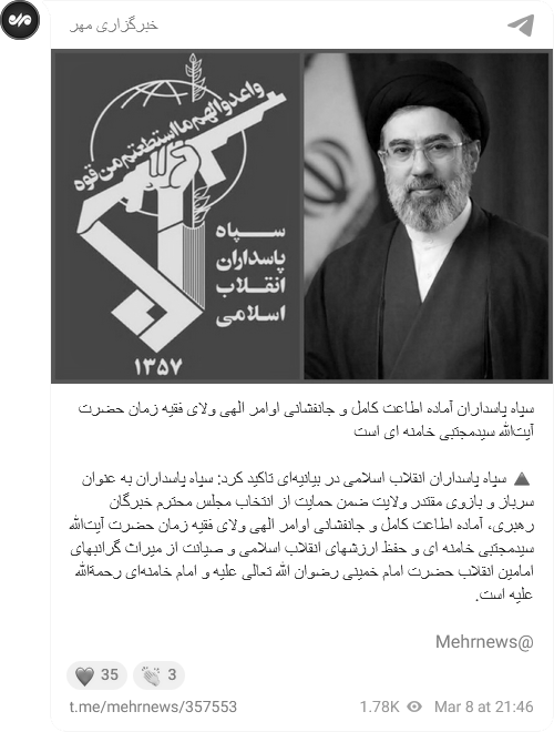El Cuerpo de la Guardia Revolucionaria Islámica (CGRI) anunció este domingo su juramento de lealtad al nuevo líder supremo de Irán, Seyed Mojtabá Jameneí, tras su elección como sucesor de su padre, Ayatolá Alí Jameneí.