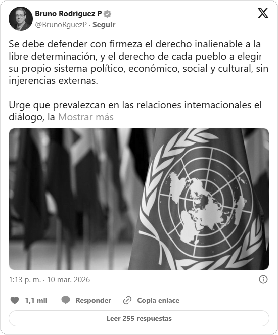 «Se debe defender con firmeza el derecho inalienable a la libre determinación, y el derecho de cada pueblo a elegir su propio sistema político, económico, social y cultural, sin injerencias externas», reiteró en su cuenta de X el canciller cubano, Bruno Rodríguez Parrilla.