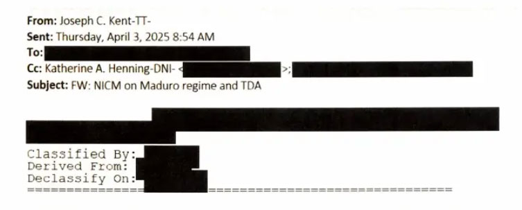 En este intercambio clasificado, Kent exigió modificar las conclusiones de los analistas que no encontraban pruebas del vínculo entre el gobierno de Nicolás Maduro y la banda criminal Tren de Aragua, el mismo argumento jurídico que Washington usaría meses después para justificar la operación militar del 3 de enero.