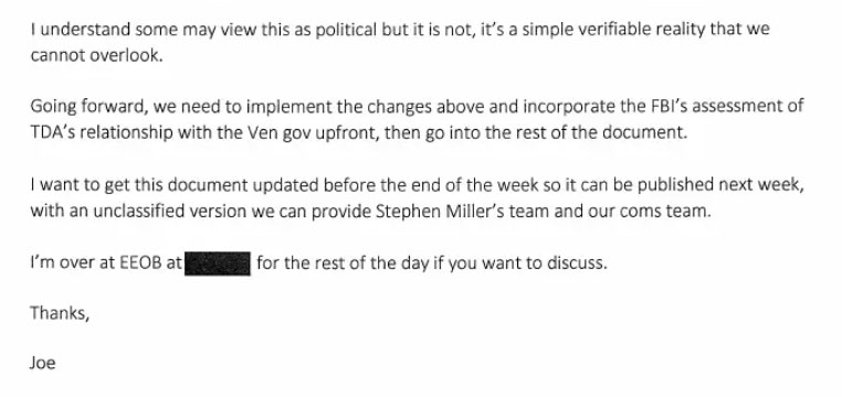 Dieciocho días después, el 3 de abril, Kent escribió a analistas senior del Consejo Nacional de Inteligencia. El borrador en su poder concluía que el gobierno venezolano «probablemente no tiene una política de cooperación con el Tren de Aragua y no está dirigiendo sus movimientos hacia Estados Unidos», una conclusión que destruía la base legal de la proclamación presidencial.