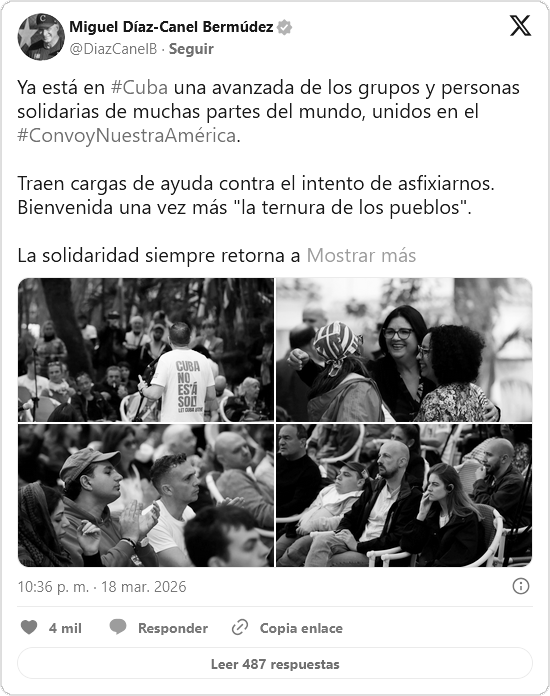 «Ya está en #Cuba una avanzada de los grupos y personas solidarias de muchas partes del mundo, unidos en el #ConvoyNuestraAmérica«, anunciaba el presidente de Cuba, Miguel Díaz-Canel Bermúdez, en su cuenta en la red social X.