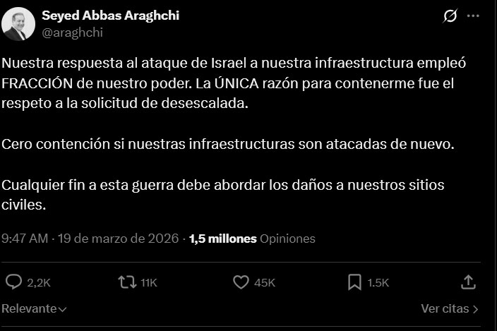 En ese mismo mensaje, el canciller iraní introdujo una exigencia política y humanitaria, cualquier eventual finalización de la guerra, indicó, debe incluir una atención concreta a los daños causados a infraestructuras y sitios civiles iraníes.
