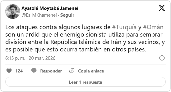 «Los ataques contra algunos lugares de Türkiye y Omán son un ardid que el enemigo sionista utiliza para sembrar división entre la República Islámica de Irán y sus vecinos, y es posible que esto ocurra también en otros países» expresó el líder iraní a través de sus redes sociales.