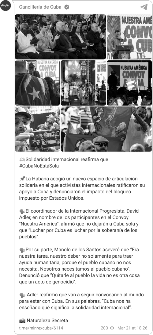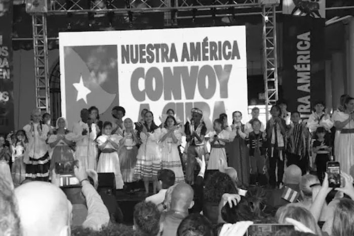 El presidente cubano, Miguel Díaz-Canel Bermúdez, lideró este sábado el acto de recibimiento y bienvenida a los integrantes del convoy «Nuestra América» en la capital. La iniciativa internacional de solidaridad surge como respuesta a la intensificación del bloqueo económico, comercial y financiero impuesto por el Gobierno de Estados Unidos contra la isla, lo que el presidente calificó como una asfixia económica y energética al pueblo antillano.