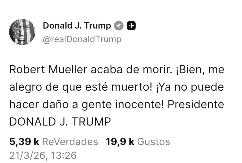 «Robert Mueller acaba de fallecer. Bien, me alegro de que haya muerto. ¡Ya no podrá hacer daño a gente inocente!», escribió Trump en Truth Social.