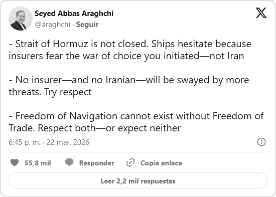 Irán rechazó las amenazas de Estados Unidos sobre el control del estrecho de Ormuz y reafirma su soberanía frente a la agresión imperialista en la región. Este lunes 23 de marzo, el ministro de Asuntos Exteriores de Irán, Abbas Araghchi, declaró que su nación no cederá ante la presión militar de Washington y desmintió el cierre total de la vía marítima estratégica.