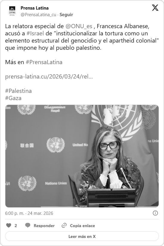 La relatora de la ONU para los territorios palestinos ocupados, Francesca Albanese, a través de un informe presentado ante el Consejo de Derechos Humanos, denunció que Israel ha institucionalizado la tortura como eje central del genocidio contra el pueblo palestino. Ante esta situación, la experta exigió emitir órdenes de detención contra los ministros israelíes señalándolos como responsables directos de crímenes de lesa humanidad.