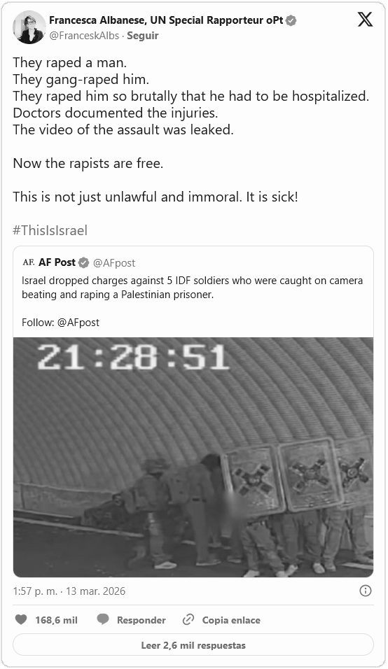 Albanese denunció que, desde octubre de 2023, Israel ha convertido el abuso de detenidos en una política estatal amparada por una cultura del sadismo. Según la experta, las autoridades de ocupación no solo permiten estas prácticas, sino que presumen abiertamente de ellas, llegando a autorizar que civiles y periodistas filmen las humillaciones sufridas por los más de 18.500 palestinos arrestados, entre los que se encuentran médicos, reporteros y niños.